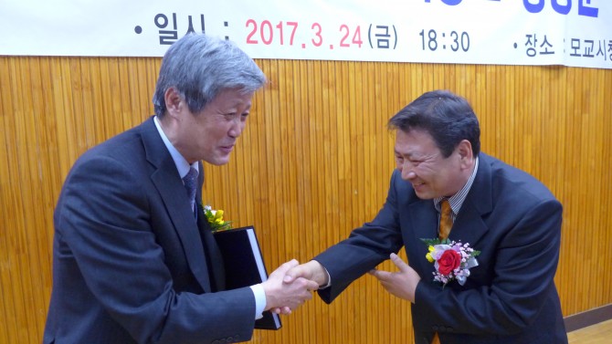 [한흥교 사무총장이 한복수 동문에게 화환증정]